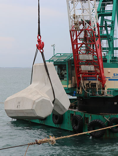 金沢港の大野地区で、防波堤の改良工事を行っています。波の勢いを弱めるためにブロックを設置し、防波堤の破損や倒壊を防いでいます。これによって、港の中に波が入りにくくなり、船の安全を守ることができます。