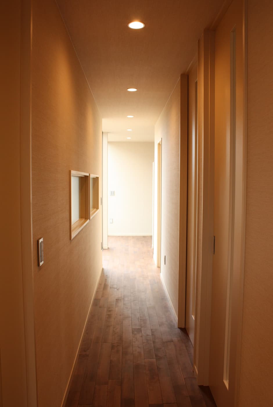 家の中心部にリビングを配置し、主寝室へはリビングからの動線がコンパクトに配置されておりますが、お子様たちの部屋への動線には廊下を設け、プライベートが守られるように配置されています。
